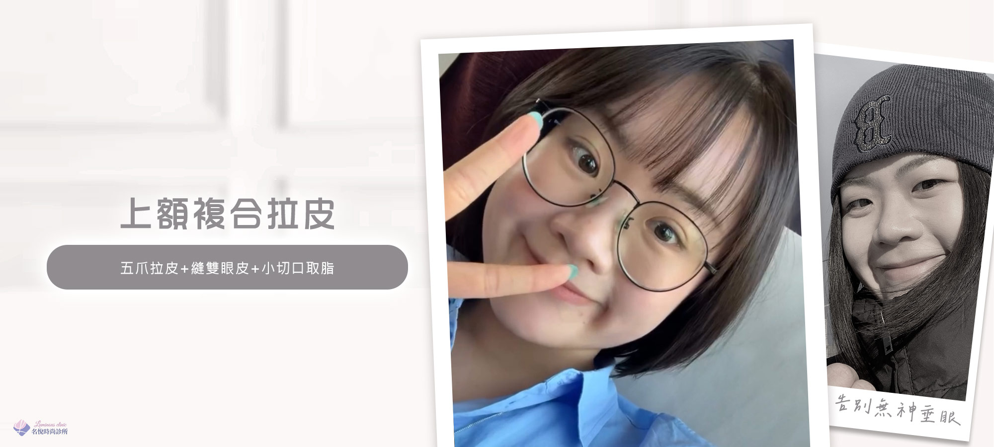 Sunny從學生時期就一直有眼神無神的問題,看起來總是沒精神。看到名悅時尚診所的李京軒醫師雙眼皮案例,心動的直接來找李京軒醫師諮詢,諮詢後決定透過上額拉手術、縫雙眼皮跟小切口取脂,讓眼神跟眼皮變得更加有元氣、更精神!