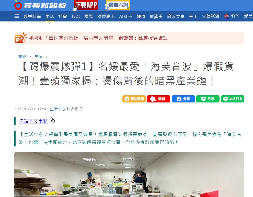 近日新聞報導出現市面上出現「假機器」「假探頭」,北檢與刑事局破獲了這個跨境走私集團,查扣了「第三代海芙音波」非法探頭與儀器,假機混租到沒有原廠認證診所施打「海芙音波」,這種破解改裝、假機水貨的治療風險相當高,同樣花費這樣高的金額,要如何保障自己的權益呢?