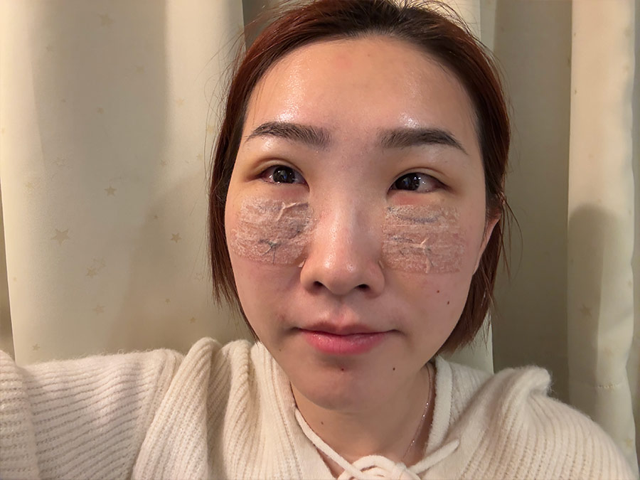 脂肪轉位手術,會在淚溝處用縫線固定轉位的脂肪。並用透氣膠帶加壓固定。