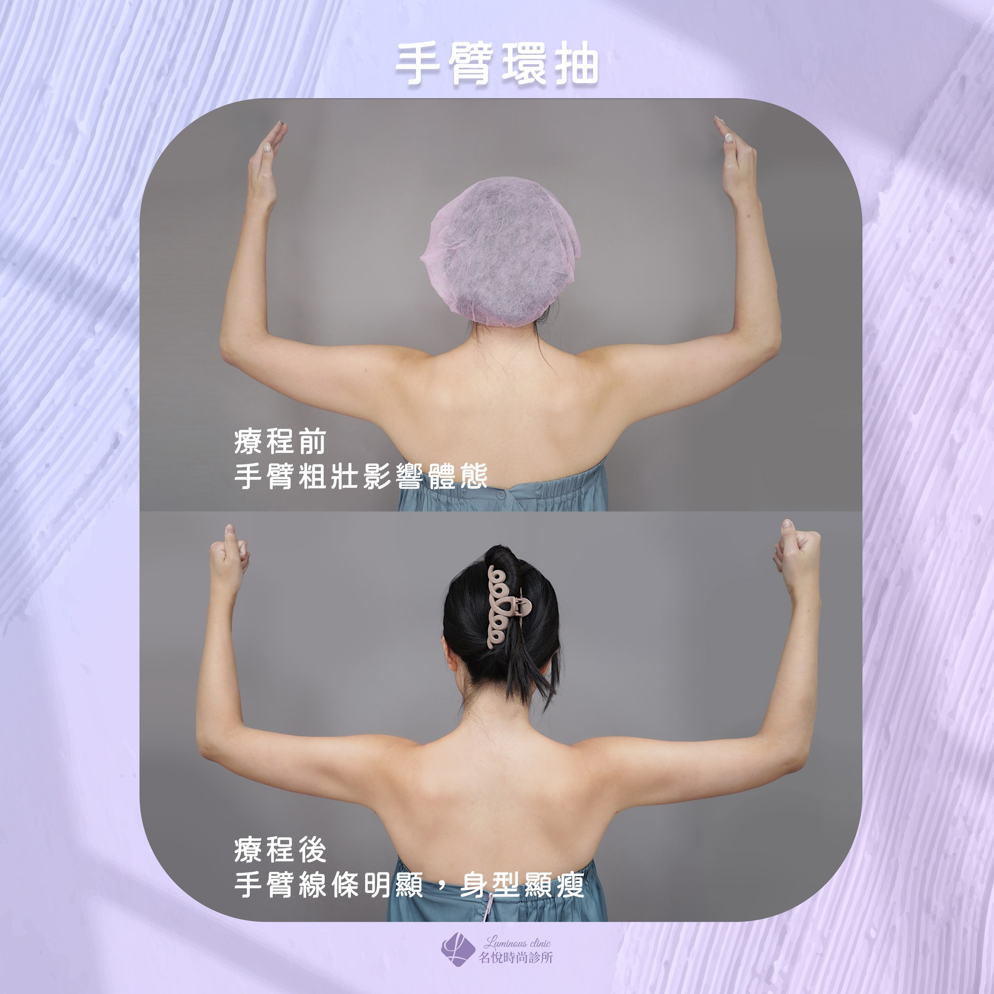 手臂抽脂包括手臂環抽、掰斷袖子(蝴蝶袖)抽脂會需要考慮手臂的活動度以及皮膚彈性和個別區域要抽出的脂肪量,避免凹凸不平。